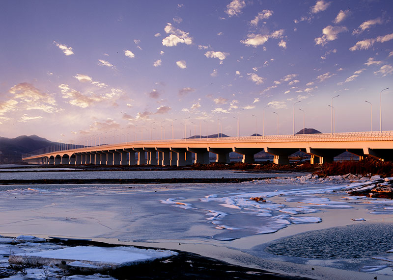 大橋工程分為主橋、預制段引橋和北側現澆段引橋,其中主橋長500米,主跨為120米的大跨變截面預應力混凝土連續箱梁,是當時東北地區跨度最大的連續梁跨海橋。大橋的設計結合了使用和景觀的雙重功能,作為普灣經濟區核心位置的地標性景觀,獨具特色的夜景設計使其成為經濟區一道亮麗的風景線。
